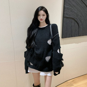 早秋上衣慵懒设计感小众个性破洞宽松中长款毛衣套头长...