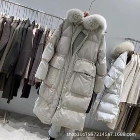 羽绒服韩国冬季连帽狐狸毛领长袖抽绳收腰显瘦长款白鸭...