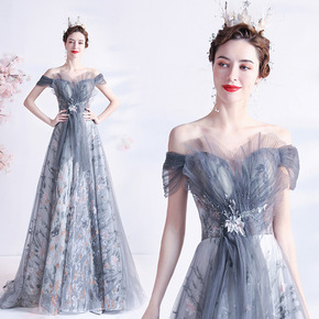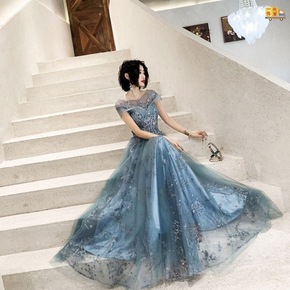 一字肩减龄晚礼服蓝色女婚礼年会主持人仙气星空梦幻气...