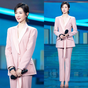 明星同款粉色飘带西装套装美业职业装气质晚会主持人正...