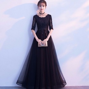 晚礼服裙女2021新款长款黑色中袖时尚显瘦名媛宴会...