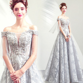 天使的嫁衣 灰色长袖晚宴年会演出独唱主持人走秀婚纱...