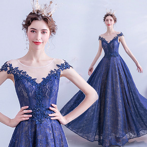 天使的嫁衣 蓝黑色长袖宴会年会演出主持人婚纱晚礼服...