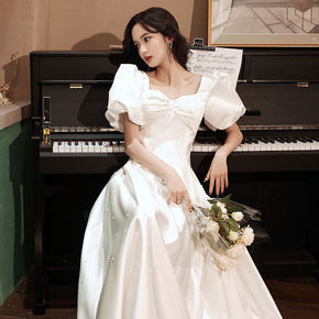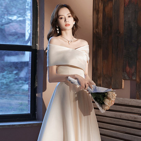 缎面敬酒服新娘2021新款冬季结婚订婚晚礼服裙女主...