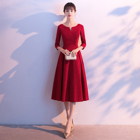 新娘敬酒服婚礼回门订婚结婚红色长袖中长款修身晚礼服...