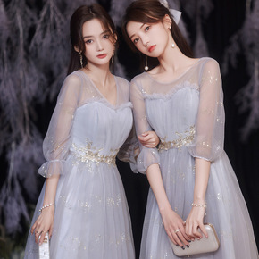 伴娘服2021新款灰色姐妹团服裙宴会主持人晚礼服大...