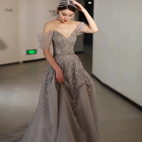 年会晚礼服裙女灰色轻奢小众仙气质主持人宴会一字肩显...