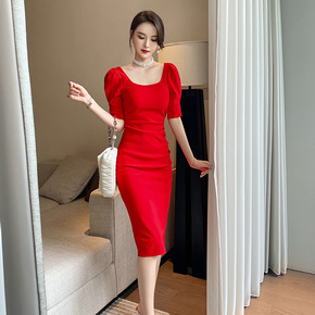 敬酒服新娘女夏季订婚答谢宴小礼服裙红色方领连衣裙平...