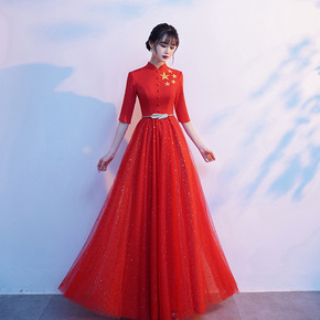 中国风红色主持人晚礼服裙2021新款秋装连衣裙国庆...