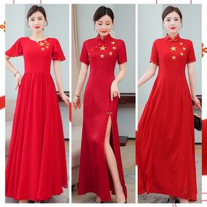 红歌合唱团演出服女长裙舞台朗诵周年表演指挥主持人红...