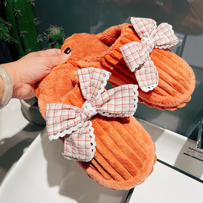韩货新品甜美格子蝴蝶结毛绒棉拖鞋女士软底防滑加绒加...