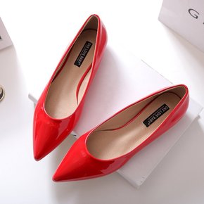 秋季女鞋欧美红色婚鞋尖头平底鞋漆皮黑色软底浅口单鞋...