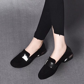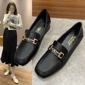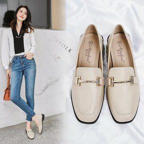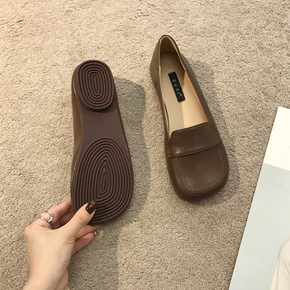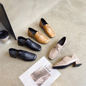 全女鞋方跟方头深口单鞋牛皮简约复古百搭平底鞋乐福鞋...