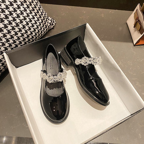 2021秋季新款水晶冰花玛丽珍单鞋女高跟漆皮乐福鞋...