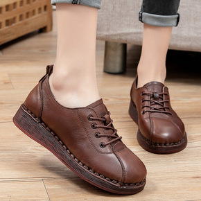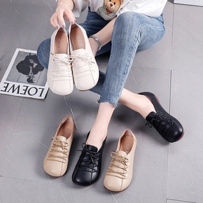 2021春秋季新款复古真皮牛筋底单鞋低帮深口系带圆...