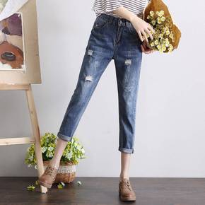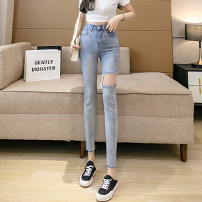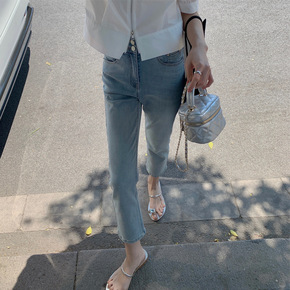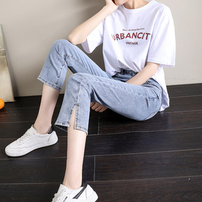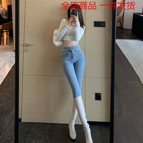 开叉牛仔裤女高腰显高显瘦2022韩版新款九分弹力微...
