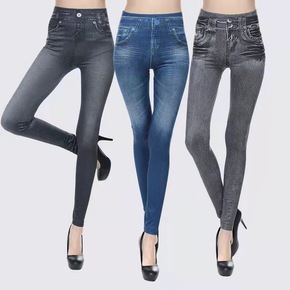 2021欧美跨境TV仿牛仔拉毛印花打底裤女 高腰外...