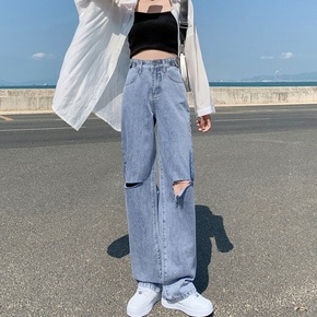 设计感高腰阔腿牛仔裤女宽松显瘦裤子女春夏新款直筒小...