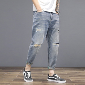 夏怀旧牛仔裤男九分时尚休闲破洞宽松青年ANSICA...