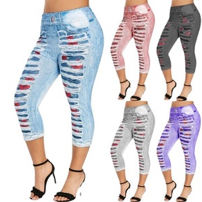 现货!2022新款破烂牛仔数码印花运动打底裤瑜伽跑...