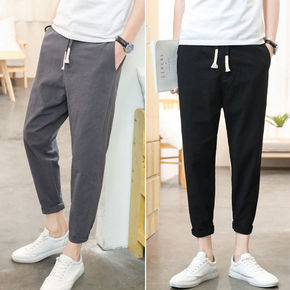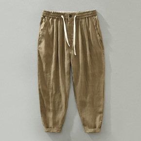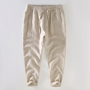 春夏季新款男士中腰苎麻裤系绳松紧腰棉麻料透气休闲九...