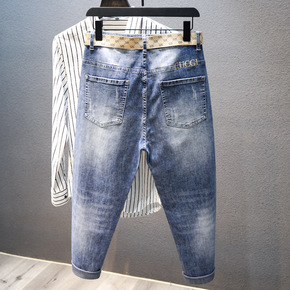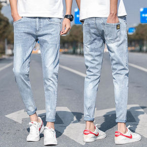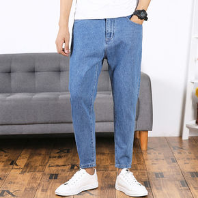 夏季宽松九分裤男牛仔裤青少年学生哈伦裤浅蓝色萝卜裤...