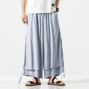 日系棉麻薄款宽松休闲大码九分裤阔腿裤复古禅舞裙裤喇...