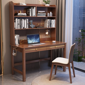 新中式轻奢办公桌实木书桌书架一体家用台式电脑桌卧室...