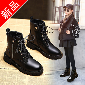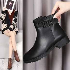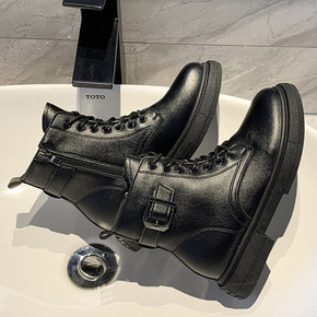 2021年欧美秋季新款圆头纯色贴皮侧拉链平底马丁靴...