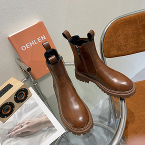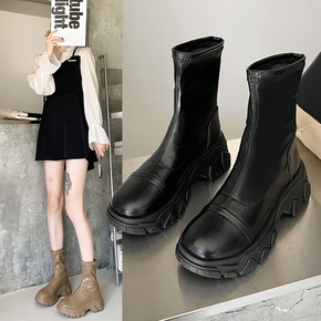 切尔西短筒靴女松糕跟厚底圆头纯色套筒时装靴春秋季简...