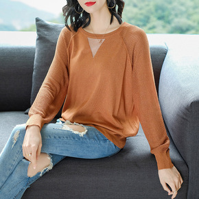 娃娃领宽松针织衫女2022春季新款大码显瘦长袖T恤...