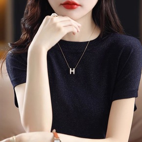 夏季早秋时尚半袖亮丝鎏金亚麻天丝女t恤针织冰丝上衣...