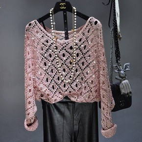 20秋冬新款女装高品质简约纯色复古钉亮珠片拼银丝V...