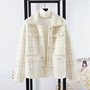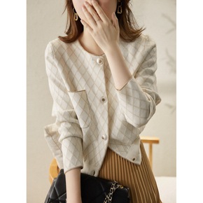 小香风针织开衫水貂绒春秋装毛衣外套女宽松洋气格子外...