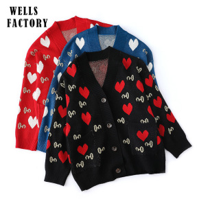 新款韩版撞色毛衣开衫女宽松甜美爱心很仙的针织衫外套...
