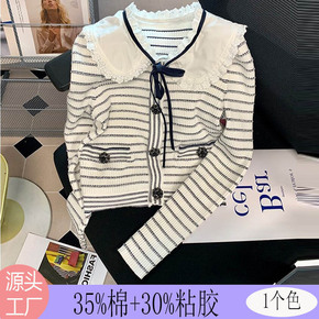 白条纹蝴蝶结系带娃娃领针织上衣开衫 花朵纽扣蓝白银...