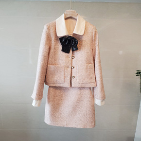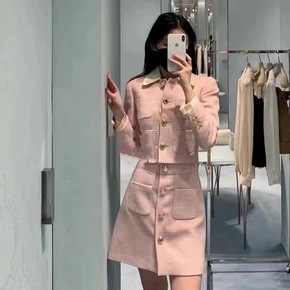 缪家新款格纹羊毛面料亮片点缀金扣外套+半裙套装少女...