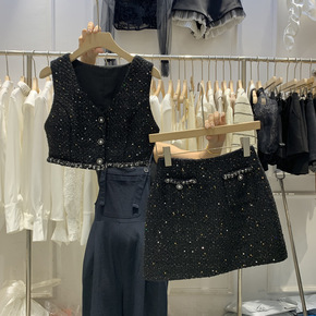 小香风名媛粗花呢亮片无袖v领马甲半身裙小个子两件套...