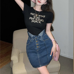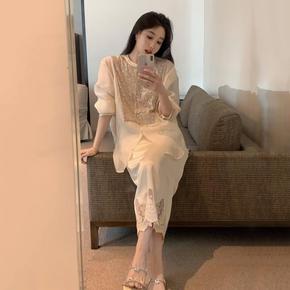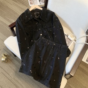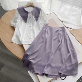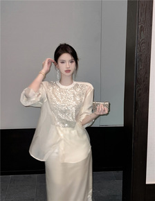圆领亮片拼接长袖衬衫上衣绸面辣妹半身裙两件套女夏轻...