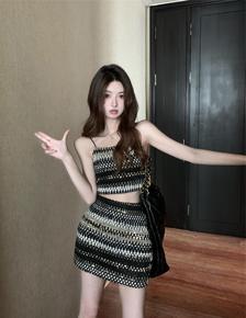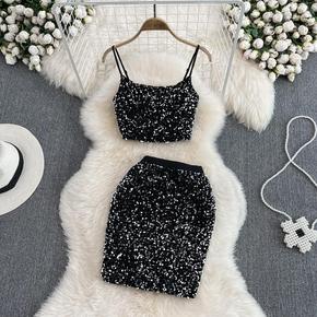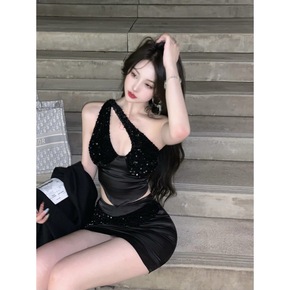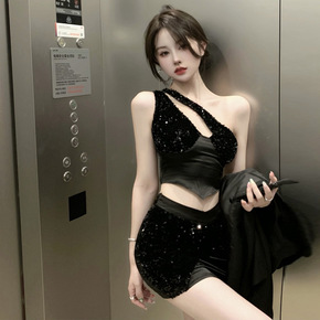 昕可达 亮片拼接缎面斜肩性感黑色吊带上衣半身裙套装...