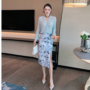 2022早秋新款马海毛绣亮片针织衫淑女提花开叉半裙...