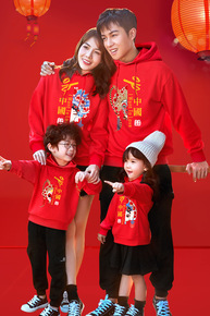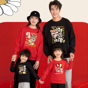 亲子装2021年一家三口四口秋冬新款卫衣红色过年服...