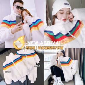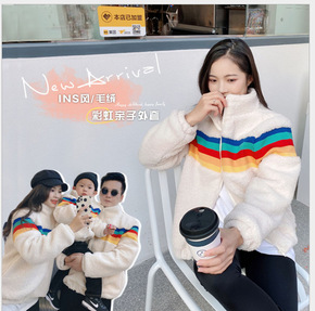 婴儿亲子装羊羔毛2021冬彩虹外套一家三口母子母女...