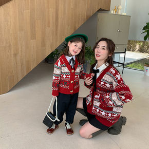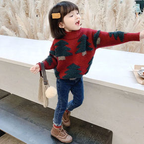 女童圣诞加绒毛衣2021年新款儿童洋气打底针织衫红...