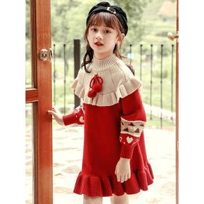 女童加绒连衣裙洋气童装儿童女宝宝圣诞节衣服红色毛衣...