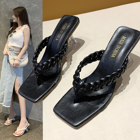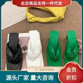 2022夏季新款女鞋方头夹脚人字拖粗跟中跟拖鞋外穿...