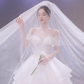白色一字肩法式轻主婚纱2022新款新娘公主超仙小个...