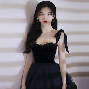 生日晚礼服女2022秋冬新品黑色宴会吊带仙气毕业主...