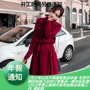 普莱雅女装气质裙子21春秋款腰绑带高领长袖大裙摆羊...