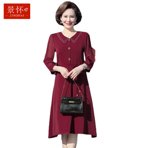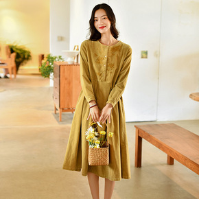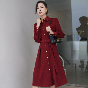 2020亚马逊秋冬大摆翻领单排扣衬衫女连衣裙中袖纯...